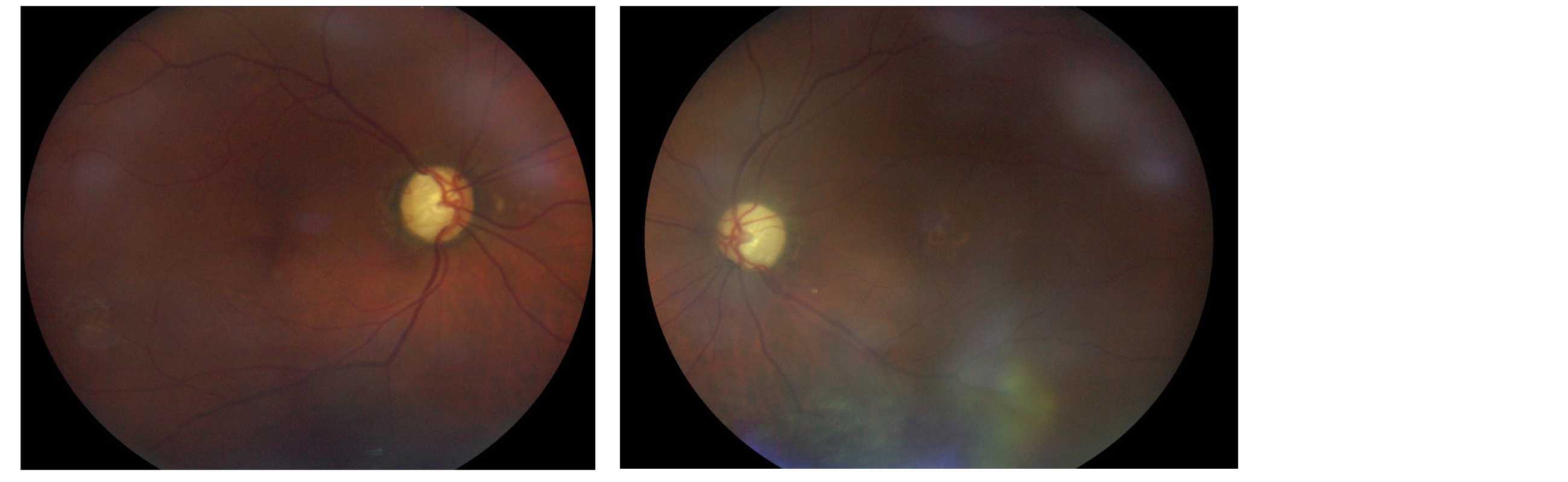 A 72-year-old male patient had been diagnosed with primary open-angle glaucoma for 4 years. He is pseudophakic in both eyes and has bilateral extended depth-of-focus intraocular lenses. The patient had previously been referred to a sleep clinic and diagnosed with obstructive sleep apnea. During routine follow-up, fundus photography (Figure 1) revealed marked structural damage in both optic nerves, including extensive cupping nearing 90%. The OCT (Figure 2) revealed prominent beta-zone atrophy, and classic bayonet vessel signs – despite maintaining good visual acuity (20/20 in the right eye and 20/25 in the left eye). His current treatment consisted of timolol, brimonidine, Ginkgo biloba 120 mg daily, and continuous CPAP therapy. However, obtaining a visual field was not available in this particular case.