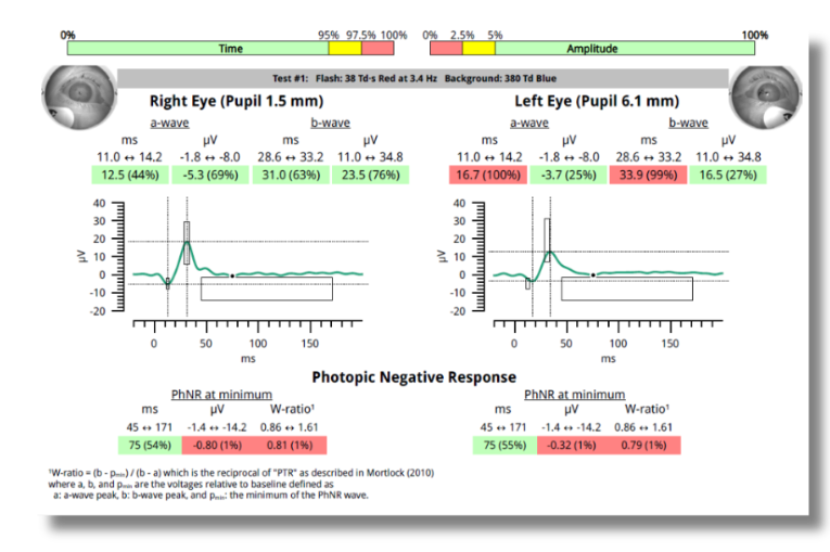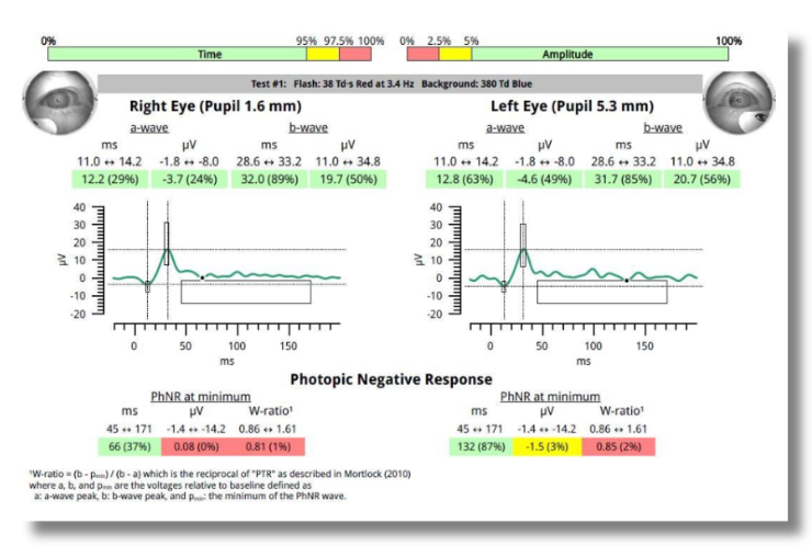 When the W-ratio is below 11% and/or b-wave time above 89% on the PhNR Report, the results are consistent with advanced glaucoma. In this case, the the W-ration was well below 11% in both eyes. At that time, the patient did not take topical glaucoma therapy, which was initiated at this visit. Three months after starting treatment, a follow-up ERG was performed (Figure 4), showing improvement in the b-wave time from 32ms (89%) to 31ms (63%) in the right eye. The W-ratio remained relatively stable at 0.81 in the right eye, however the left eye improved to 0.79. The W-ratio for both eyes remained in the abnormal range.