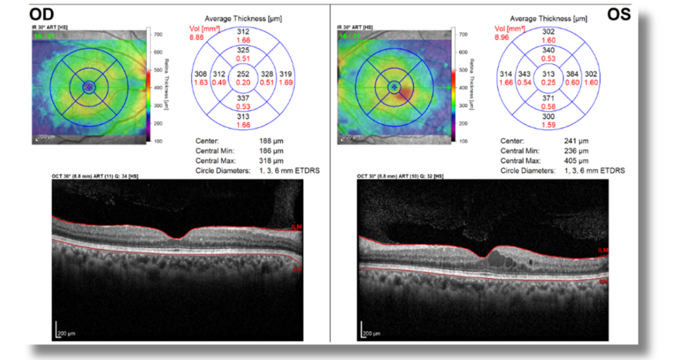 A 46-year-old patient with diabetic retinopathy and bilateral blurry vision presented to our clinic. Visual assessment revealed best corrected visual acuity of 0.8 in the left eye and 1.0 in the right eye. The left eye had a history of prior panretinal photocoagulation (PRP), and OCT findings (Figure 1) indicated mild diabetic macular edema (DMO). Given the history of PRP in the left eye, additional PRP was considered in response to signs of mild ischemia. However, the patient questioned the recommendation after experiencing loss of peripheral vision after PRP in the left eye.