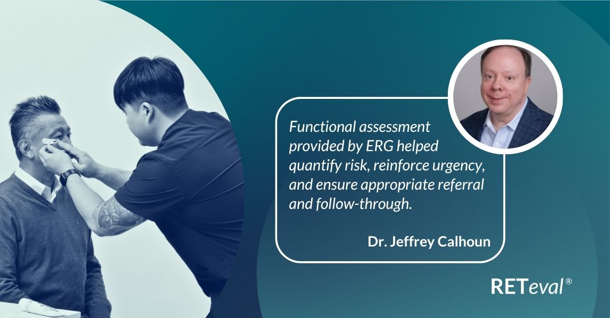 Patients with diabetes don’t always comply with prescribed courses of treatment, despite structural abnormalities that threaten their vision – instead, they may rely on medication to control their symptoms. Jeffrey Calhoun, OD, FAAO, an optometrist in Williamsville, NY, utilized his RETeval handheld ERG’s predictive DR Score to educate a patient on his risk of vision loss despite controlling his blood sugar with Ozempic.