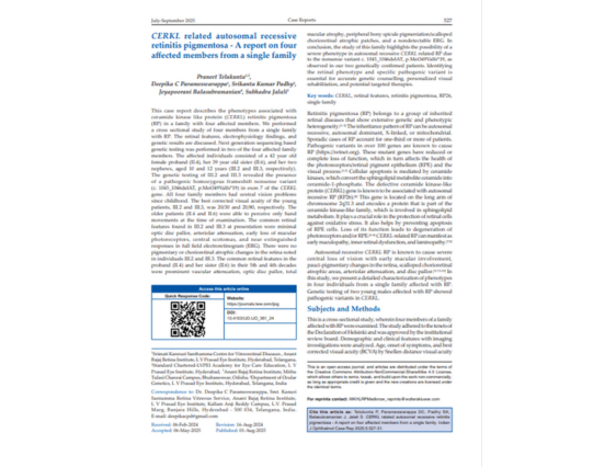 Telukunta P, Parameswarappa DC, Padhy SK, Balasubramanian J, Jalali S. CERKL related autosomal recessive retinitis pigmentosa – A report on four affected members from a single family. Indian Journal of Ophthalmology – Case Reports. Published online September 2025.